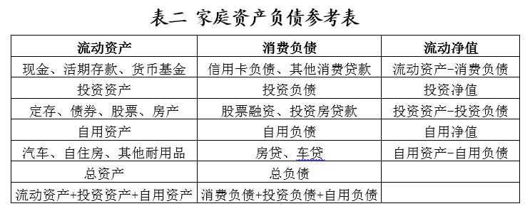 每個家庭或個人都應(yīng)有自身的資產(chǎn)負(fù)債表并定期跟蹤(可參考下表),對影響家庭資產(chǎn)負(fù)債表擴(kuò)張(收縮)或內(nèi)部結(jié)構(gòu)變化的重大事項(xiàng)(如購房、買車)要予以足夠的重視。通過與資產(chǎn)負(fù)債表相關(guān)的三個主要指標(biāo)即流動性比率、負(fù)債收入比和資產(chǎn)負(fù)債率可以監(jiān)測自身的財務(wù)健康狀況。